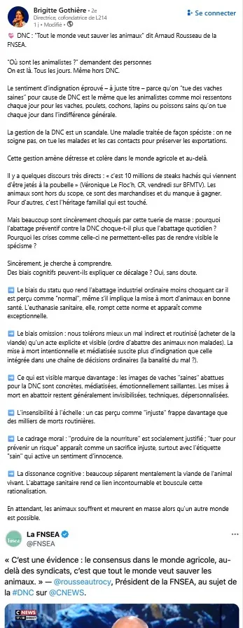 Puis elle y adosse son propre discours : "pourquoi l'abattage préventif contre la DNC choque-t-il plus que l'abattage quotidien ? Pourquoi les crises comme celle-ci ne permettent-elles pas de rendre visible le spécisme ?"