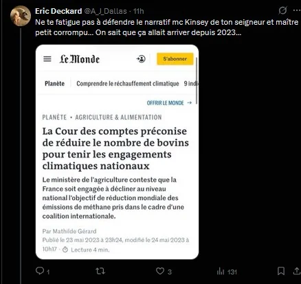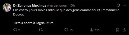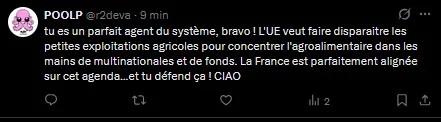 - De ne pas agir pour l'agriculture. C'est un peu agaçant sachant que j'ai consacré un temps phénoménal à étudier et dénoncer la désinformation agribashiste / pseudi-écologiste qui fait souffrir les agriculteurs.