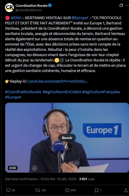 Bertrand Venteaau, président depuis peu de la Coordination Rurale, est intervenu sur Europe 1 à propos de la crise sanitaire sur la Dermatose Nodulaire Contagieuse le 15 décembre 2025.