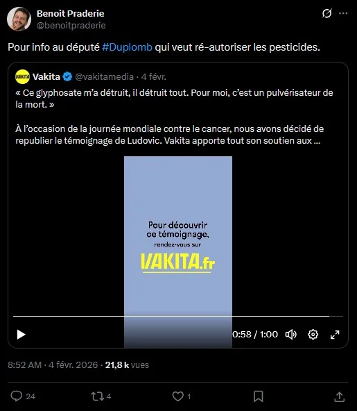 En bref, il impute son cancer au glyphosate. Évidemment Vakita présente le produit comme cancérigène, reprenant l'avis du CIRC, ce qui est contredit par la FAO/OMS et toutes les agences sanitaires.