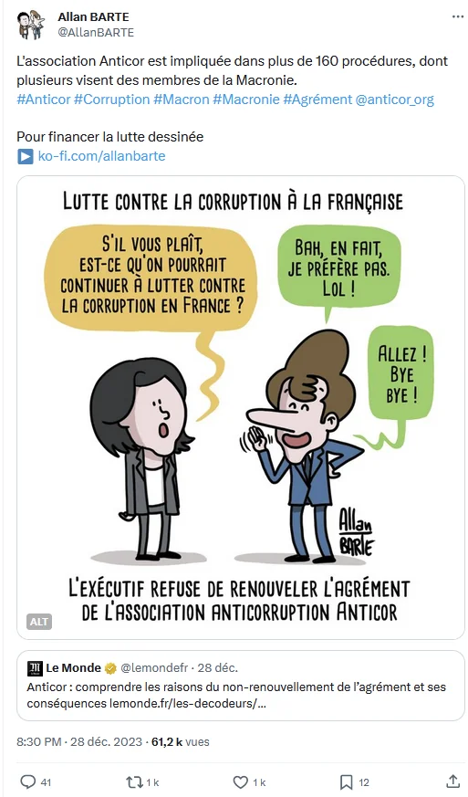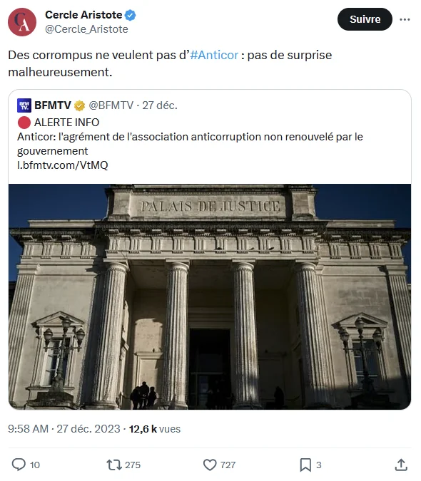 - @soufron (11.7K abonnés, avocat d'Anticor): "Anticor, c’est d’abord une association de bénévoles qui luttent partout en France contre la corruption, sans moyens, sans subventions, sans soutien politique, contre l’état, contre la justice parfois. Pas étonnant qu’on les salisse et qu’on essaie de les empêcher d’agir. Alors, soutenez les, adhérez ou faites un don !"