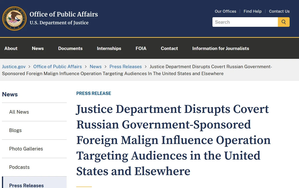- (1) DOJ, Justice Department Disrupts Covert Russian Government-Sponsored Foreign Malign Influence Operation Targeting Audiences in the United States and Elsewhere, 4 septembre 2024