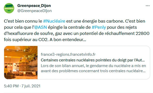 L'ASN avait reproché en 2021 à Orano "des rejets assez importants non maîtrisés" de gaz SF6 (= hexafluorure). Greenpeace en a profité pour insinuer que cela remettrait en question la nature "bas carbone" de l'énergie nucléaire (ce qui, rappelons-le, est pourtant admis par la maison mère et par le GIEC).