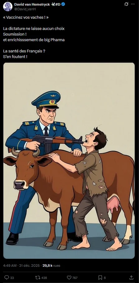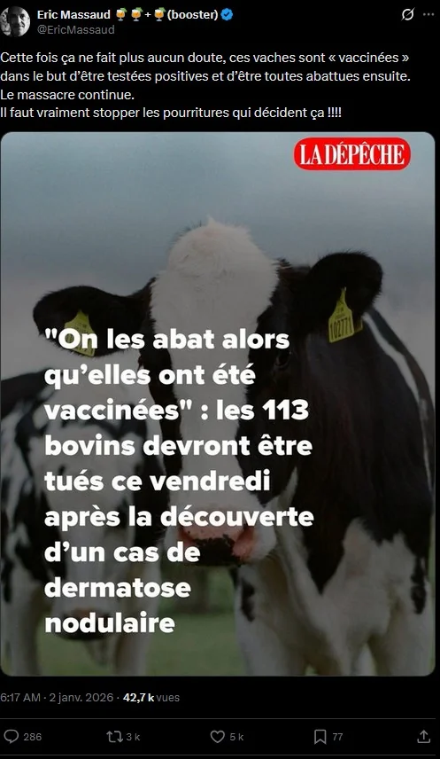 Un autre sujet de désinformation est l'abattage de vaches vaccinées. C'est présenté comme quelque chose d'absurde qui traduit la volonté du gouvernement de détruire l'élevage Français.