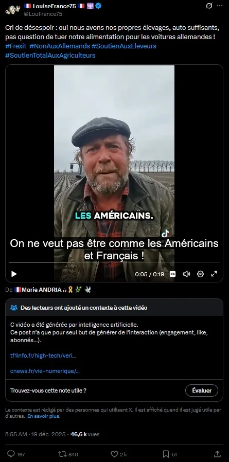 Une fake news qui a été très largement diffusée a été l'allégation, par Kyria Gay, une restauratrice-agricultrice au sud de Toulouse, le 11 décembre que 70 vétérinaires avaient refusé d'euthanasier les vaches et avaient été en conséquence radiés de l'ordre.