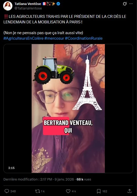 Un mois plus tard, les tracteurs étant montés manifester sur Paris Bertrand Venteau, président de la Coordination Rurale, a sonné la fin des manifestations. Tatiana Ventôse, qui l'avait pourtant bien soutenu l'a vilipendé dans une vidéo courte. Voici la transcription.
