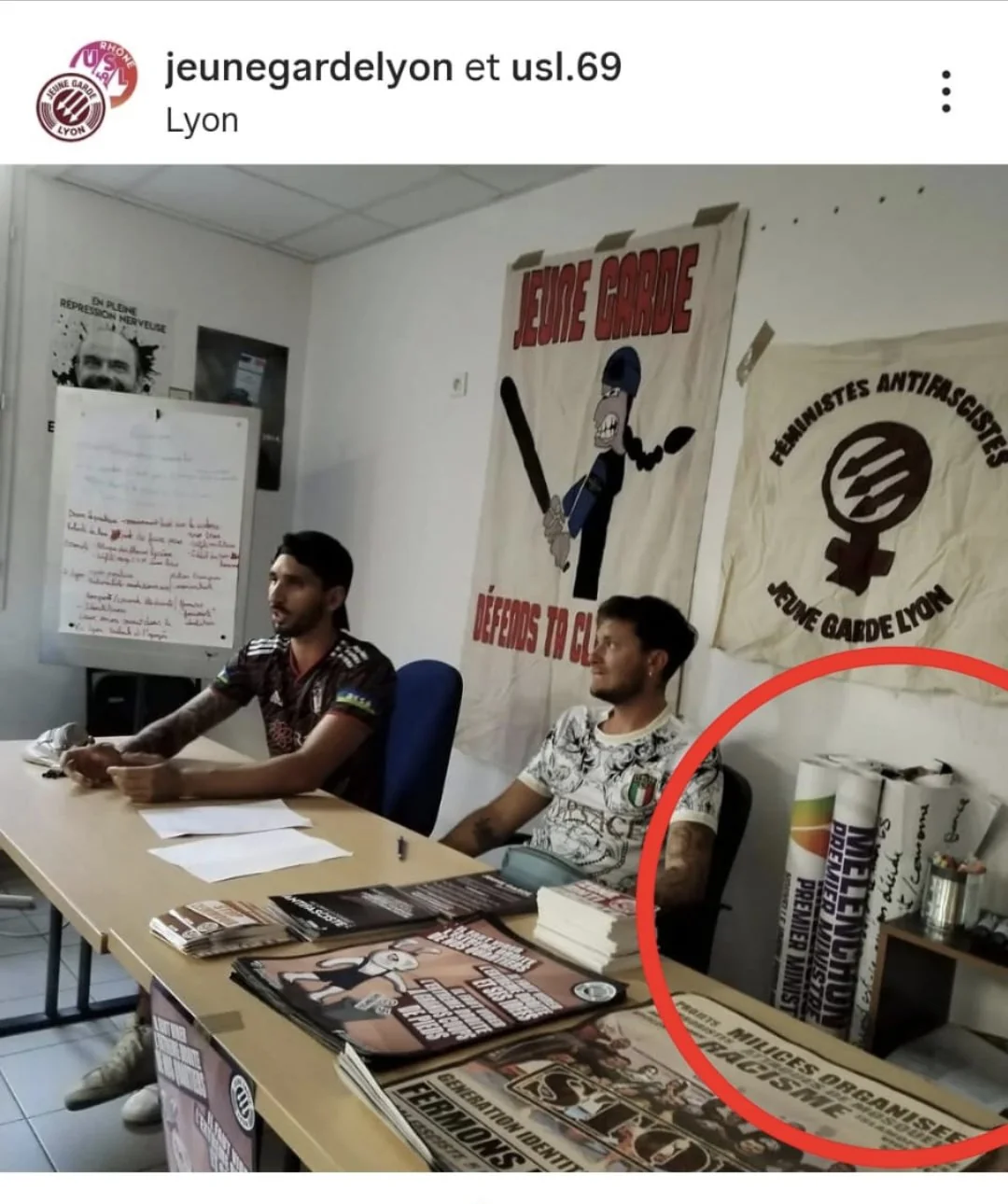 Sur une photo du local, avec Raphaël Arnault, on voit des rouleaux d'affiche à imprimer du NFP, et une "Mélenchon premier ministre".