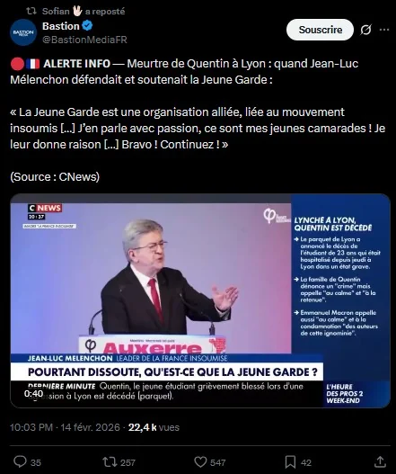 - (1) Alexandre Sulzer et Pierre Maurer, Le Parisien, « Il instaure un rapport de force » : Raphaël Arnault, le député LFI sous le feu des projecteurs après le décès de Quentin, 17/02/2026